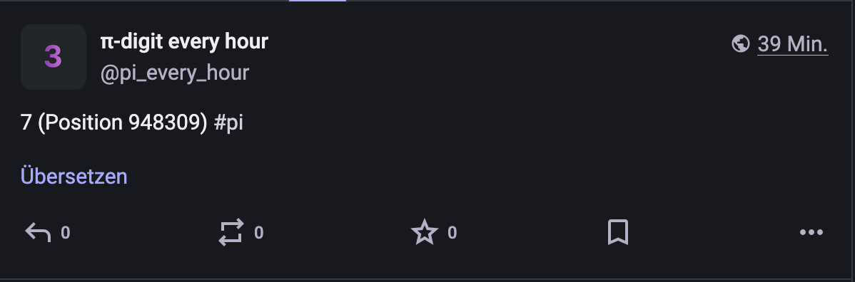 Ein einfacher, aber meditativer Bot: Jede Stunde postet er die eine Zufällige Zahl Pi. Mehr als ein Follower gibt sich (überraschend) das Ganze.