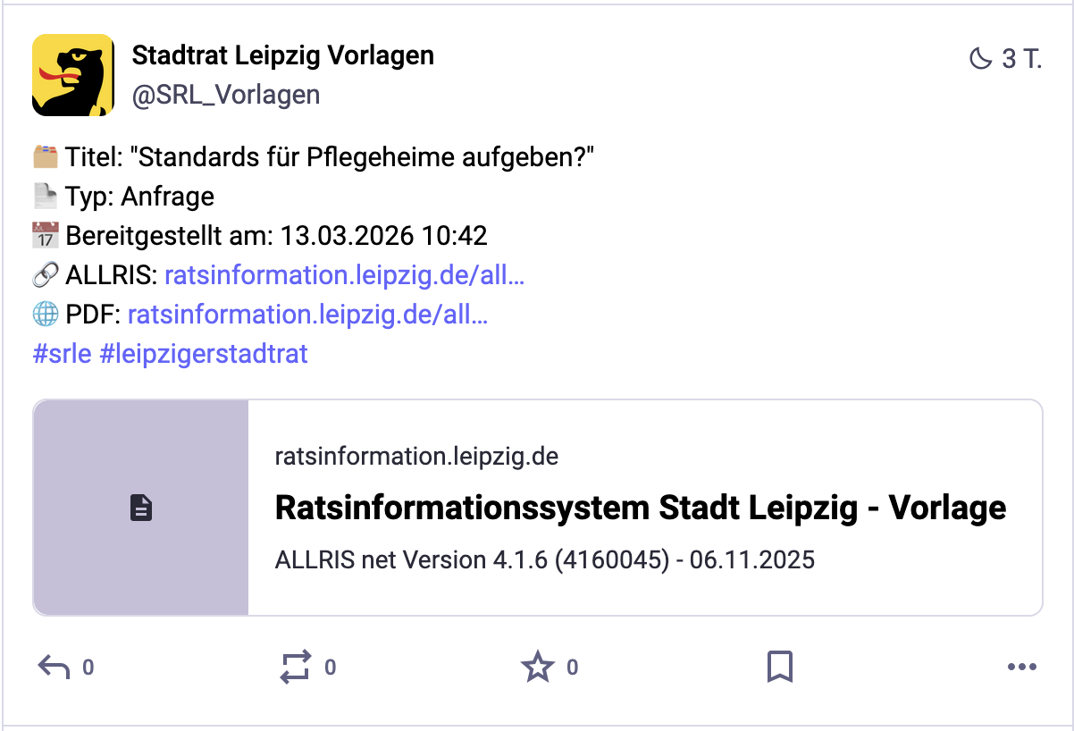 Der Bot postet neue Vorlagen aus dem Stadtrat Leipzig, sobald sie im Ratsinformationssystem veröffentlicht werden Kommunalpolitik ist oft wenig sichtbar — der Bot macht Anträge und Beschlussvorlagen etwas zugänglicher.
